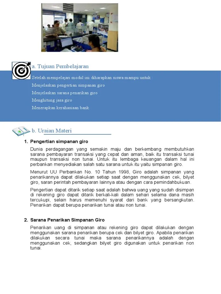 Khusus pada materi bab ini kita akan belajar tentang simpanan dana giro hingga cara menghitung jasa giro. Hal bank memberikan jasa giro kepada nasabah, maka jasa giro tersebut dicatat. Apa yang dimaksud dengan bilyet giro dan jelaskan perbedaannya dengan cek? Bagi bank jasa giro merupakan dana murah . Jelaskan metode perhitungan jasa giro yang biasa dipakai oleh bank!