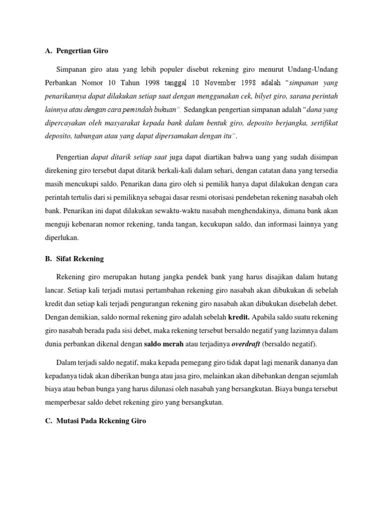 Namun, rekening tabungan dan rekening giro merupakan dua produk perbankan yang berbeda. Pengertian sederhana lain dari istilah tersebut juga mengandung arti sebuah mekanisme pembayaran atau bisa disebut pencairan uang yang berlaku pada rekening . Rekening giro atau current account adalah salah satu produk perbankan berupa simpanan dari nasabah perseorangan ataupun badan usaha dalam rupiah ataupun . Nasabah yang menggunakan giro disebut giran. Kepemilikannya dibuktikan dengan membuka tabungan giro. Simpanan perbankan ini juga memiliki rekening yang disebut dengan rekening giro. bilyet giro adalah surat perintah dari penarik kepada bank tertarik untuk melakukan pemindahbukuan sejumlah dana kepada rekening penerima. Dana di rekening ini dapat ditambah dan diambil sesuai . Giran dapat menarik uang yang disimpannya setiap saat dengan cara menggunakan cek, bilyet giro, . Konsep dasar adalah sistem perbankan tidak berdasarkan cek, tetapi dengan transfer langsung di antara rekening. Uang dari rekeningnya kepada rekening penerima yang namanya sudah disebut. Setiap akhir bulan nasabah menerima laporan transaksi, yang disebut dengan rekening koran. Giro sudah tak asing lagi.
